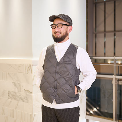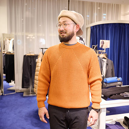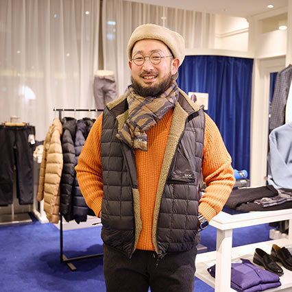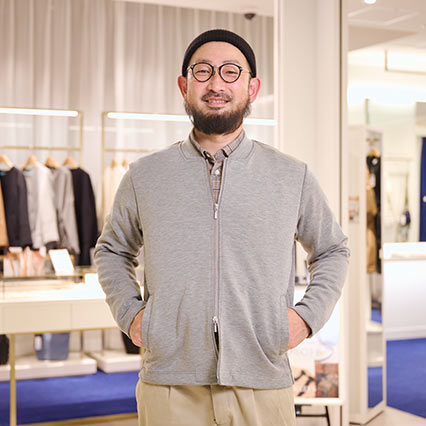 紳士服専門店、セレクトショップ勤務を経験したのち、ノーリーズに入社し現在10年目。インスタライブではつい笑いを取りにいき過ぎてしまうことも。身長177cm。