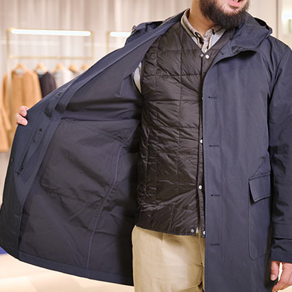 鳥海さん「丸の内を歩いても違和感の無い、大人カジュアルなスタイリングを考えました。ウールジャケットはストレッチツイードという素材を使っているので伸縮性があるうえに、暑すぎないので季節をまたいで着ていられます。胸ポケットを裏返すとそのままポケットチーフにもなるギミックも。ジレタイプのベストは体にピタッとフィットするので着膨れせず、しっかりダウンが使われているのでこれだけでもかなり温かいです。キャップにもウール素材のものを合わせてまとめました」