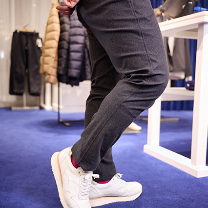 鳥海さん「最後は東京駅から新幹線に乗る旅行スタイリング。ニットは『BATONER』の別注カラー。独自の糸を使っており柔らかい着心地が特徴です。インナーは気温に合わせてカットソーのみ、もしくはカットソー+ネルシャツ、といった組み合わせも。パンツは360度全方向にストレッチが効く『ワンダーシェイプ』という素材を使っています。そして『TAION』のリバーシブルダウンベストと、裏地がフリース素材になっている『TAION』のキャップとマフラーを合わせることで、重ね着しすぎずに、真冬でも過ごしやすい格好になっています」