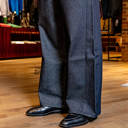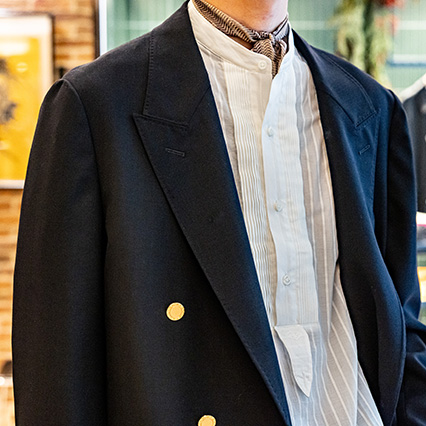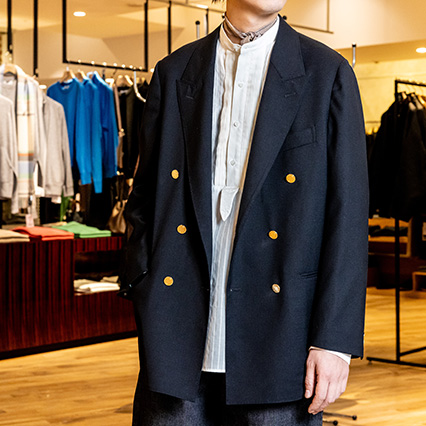 〈エディフィス〉ブレザー 74,800円 / ノーカラーシャツ スタッフ私物 / 〈エディフィス〉デニムパンツ(着用サイズ:32)19,800円 / 〈エディフィス〉チーフ 17,600円 /シューズ スタッフ私物
