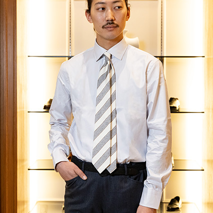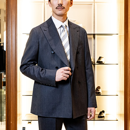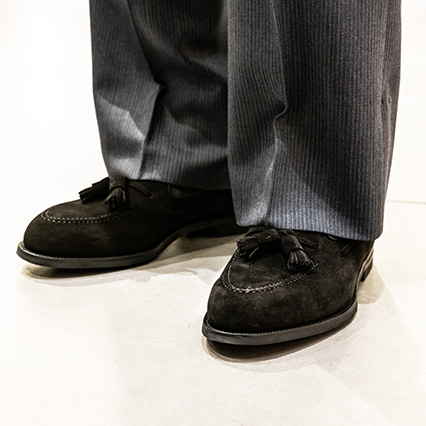 足元にはスムースレザーのシューズではなく、あえてスエードレザーのタッセルローファーを合わせて『抜け感』を演出。TPOを意識しながら、遊び心も忘れない着こなしは、大人の余裕を見せたいシチュエーションに最適なんです」