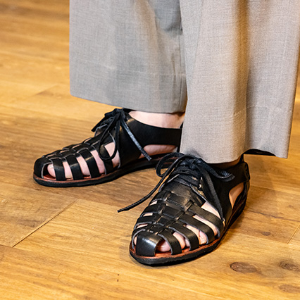 〈エディフィス〉ジャケット 41,800円 /カットソー スタッフ私物 /〈エディフィス〉パンツ 27,500円 /〈エディフィス〉肩に巻いたカットソー 15,400円 /〈Caboclo〉サンダル 29,040円